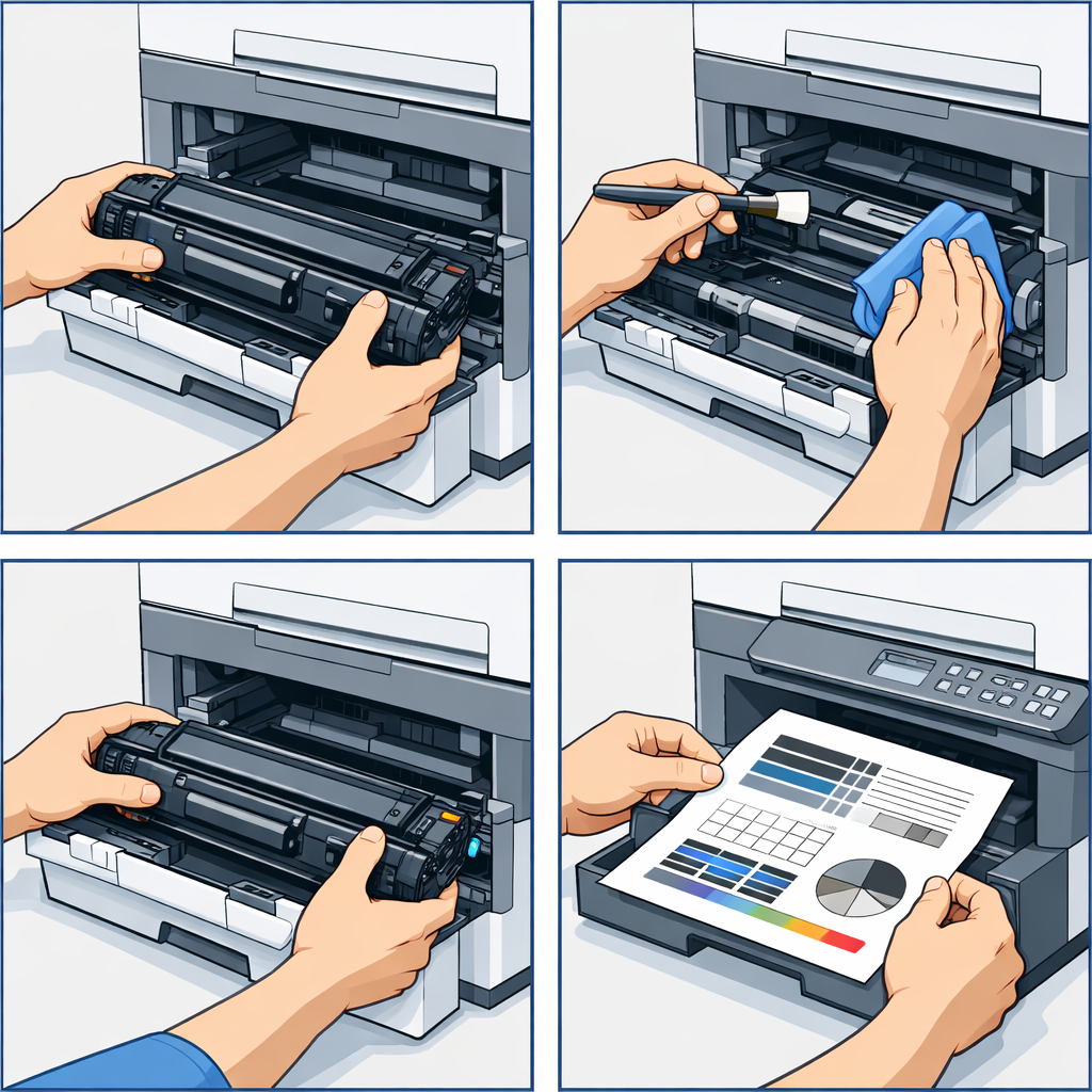 Bước đầu tiên là kiểm tra toàn diện. Kỹ thuật viên sẽ xem xét tình trạng máy in, loại mực đang sử dụng, mức độ hao mòn của drum và các linh kiện liên quan. Họ cũng hỏi bạn về tần suất sử dụng và loại tài liệu thường in để tư vấn phù hợp. Không phải lúc nào cũng chỉ cần đổ mực đơn thuần.