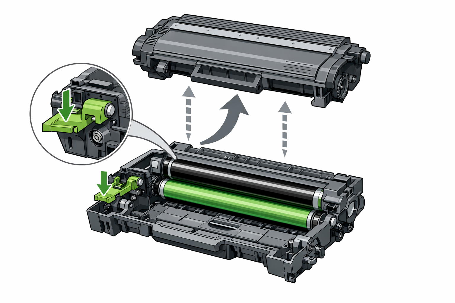Sau khi lấy ra, đặt cụm trống và cụm mực lên một mặt phẳng sạch sẽ mà bạn đã lót sẵn giấy báo hoặc khăn giấy. Quan sát kỹ, bạn sẽ thấy có một lẫy màu xanh lá cây ở phía bên trái.