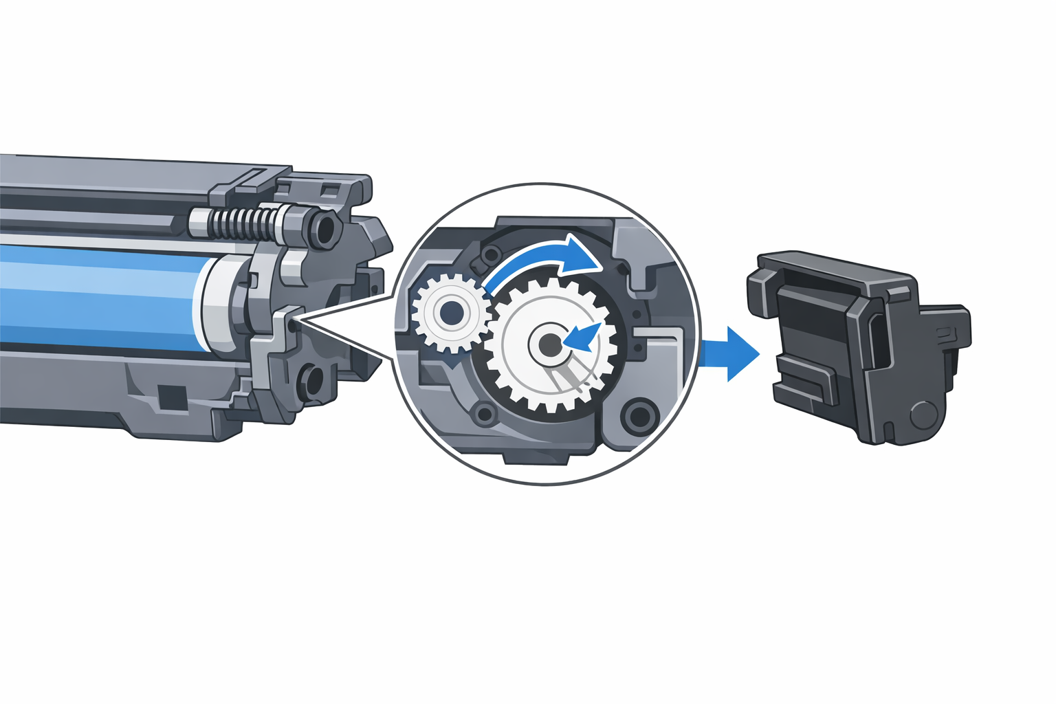 Tại sao lại như vậy? Bởi vì hộp mực Brother TN-B022 có một cơ chế đếm số trang in thông qua bánh răng reset. Khi hộp mực được sử dụng hết, bánh răng này sẽ ở một vị trí nhất định báo hiệu “đã hết mực”. Nếu không reset lại bánh răng về vị trí ban đầu, chip nhớ trong hộp mực vẫn nghĩ rằng mực đã cạn.